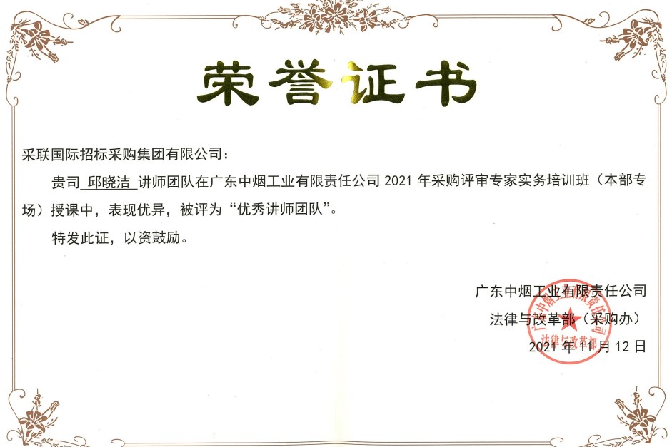 2021年10月至11月,廣東中煙工業(yè)有限責(zé)任公司(以下簡稱“廣東中煙”)舉辦了“2021年采購評審專家培訓(xùn)”系列活動,本次培訓(xùn)覆蓋廣州、韶關(guān)、梅州、湛江四地卷煙廠及市場營銷中心、廣東中煙本部,眾多評審專家在這六場培訓(xùn)中獲益。采聯(lián)國際招標采購集團有限公司(以下簡稱“采聯(lián)集團”)高度重視本次培訓(xùn),派出了專業(yè)一流、服務(wù)細致、實務(wù)操作和理論分析能力俱佳的講師團隊參與本次培訓(xùn)。