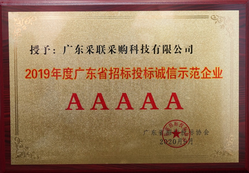 廣東省招標(biāo)投標(biāo)協(xié)會發(fā)布《關(guān)于“2019年度廣東省招標(biāo)投標(biāo)誠信示范企業(yè)”創(chuàng)建活動表彰決定》:廣東采聯(lián)采購科技有限公司(以下簡稱“采聯(lián)科技”)憑借誠信經(jīng)營以及良好的品牌形象在眾多企業(yè)中脫穎而出,被授予“2019年度廣東省招標(biāo)投標(biāo)誠信示范企業(yè) AAAAA”榮譽稱號。